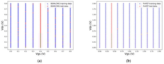 For the BSIM-CMG simulation dataset shown in Figure 1a, the and values range from 0 to 0.8 V, with sampled at intervals of 0.1 V, and sampled at intervals of 0.01 V. For the experimental 12 nm FinFET dataset shown in Figure 1b, an extended voltage range of 0 to 2 V is used, with sampled at intervals of 0.2 V and sampled at intervals of 0.05 V. This extended range ensures model robustness outside normal operating regions. All data points where = 0.4 V, along with additional randomly selected points to maintain the 9:1 ratio, are used as the test dataset, while the remaining data are used for training.