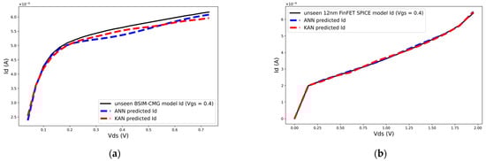 Fitting performance on unseen test data: (a) comparison between KAN and ANN models for the BSIM-CMG model, (b) comparison between KAN and ANN models for 12 nm the FinFET SPICE model.