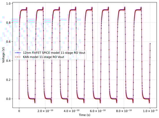 To further validate the practical applicability of the KAN model in circuit design applications, we embedded the KAN-based model for 12 nm n-type FinFET into the standard 12 nm FinFET SPICE model framework. An 11-stage ring oscillator (RO) circuit was then constructed and simulated using both the original commercial SPICE model and the KAN-embedded model. The comparison of the characteristic waveforms from both models is shown in Figure 5.
