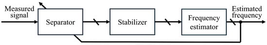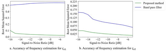 Figure 8 shows the estimation accuracy of the proposed method and BPF. Figure 8a,b represent the estimation accuracy for the frequencies of and , respectively. The proposed method achieved a higher frequency estimation accuracy than the BPF across the entire analysis range. As the frequencies of and change over time, there are periods when signals other than the signal of interest (SoI) exist within the passband of the BPF. This results in a lower frequency estimation accuracy for the BPF. In contrast, the proposed method calculates the instantaneous angular frequency and applies feedback when the SoI undergoes frequency variations, allowing it to track the SoI and perform frequency estimation. As a result, the proposed method can isolate the SoI more effectively, leading to a higher estimation accuracy.