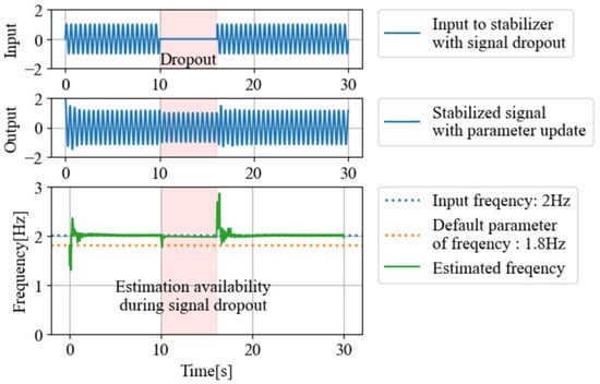 Additionally, represents the phase difference between the input signal and the output signal. can be obtained as something similar to . In the case of , the input and output synchronize as a forced oscillation. However, in Equation (5), even when , self-excited vibration occurs at . This self-excited vibration allows for a stable output of in cases of temporal disconnection and dropout, as shown in Figure 2a. Subsequently, when a signal is input again into Equation (5) and becomes non-zero, synchronizes with the angular frequency of the SoI. In the case of temporal disconnection and dropout, can output a signal synchronized with the SoI, as illustrated in Figure 2b. From the above, it can be concluded that the signal can be stably extracted even in cases of temporal disconnection and dropout.