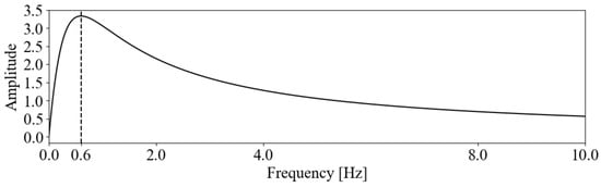 In the simulation, the input signal is a composite wave consisting of six signals with different frequency characteristics, as described in Equation (2), along with random noise. Additionally, it is assumed that a sensor with an amplitude gain , peaking at the angular frequency , is used to obtain the input signal . The amplitude gain is assumed to follow the form given in Equation (9).