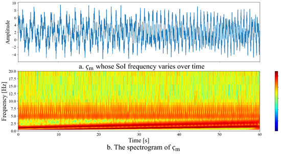 Figure 5 shows the input signal described above. Figure 5a shows the general shape of the input signal , and Figure 5b shows the spectrogram obtained by applying a continuous wavelet transform to . The initial values of the angular frequency are set as , based on the approximate frequency band visible in Figure 5b. Additionally, the parameters for the Van der Pol equation are set as , , and .