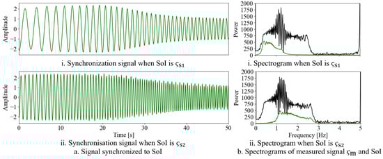For the simulation under the conditions described above, Figure 6a shows the output signals and synchronized with the input using the proposed stabilizer. Both output signals were confirmed to have been stably synchronized. Figure 6b shows the spectrogram results of , , and . The black line represents the spectral values of , while the green lines represent the spectral values of and . Figure 6b shows that by appropriately adjusting the initial values of the angular frequency , the output signal was synchronized with signals in different frequency bands.