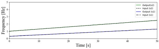 Third, the proposed method separates the measured signal into multiple frequency bands using a filter bank while simultaneously performing frequency estimation for each band. For a given SoI, the advantages mentioned above ensure that the output signal can track the frequency of each signal, as shown in Figure 7. Although the simulation demonstrated this for two signals, similar output signals can be obtained for three or more signals. In this way, the proposed method enables a stable separation of multiple signals from the measured signal. When the signals decomposed by the proposed method are represented in the frequency domain, as shown in Figure 7, frequency information such as that shown in the range of 0–2.5 Hz in Figure 5 can be obtained.