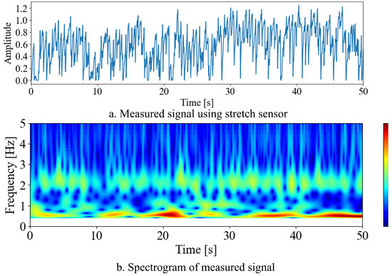 Figure 10 shows the measured signal and the results of its wavelet transform. Figure 10a illustrates the stretch of the stretch sensor, while Figure 10b presents the spectrogram of the signal shown in Figure 10a. From Figure 10, it can be confirmed that the power of the signals around 0.5 Hz and 2 Hz is high. Here, 1.54 m/s corresponds to light-to-moderate exercise. During this type of activity, the respiratory rate, heart rate, and walking rhythm are known to range between 0.40 and 0.90 Hz, 1.67 and 2.17 Hz, and 1.92 and 2.2 Hz, respectively. Examining Figure 10b, the frequency bands with a high energy align with these ranges. Therefore, it can be inferred that the biological signals included in consist of components related to respiration and components where heartbeats and walking rhythms are mixed.