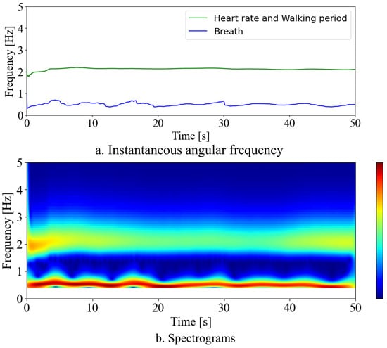 Figure 11 shows the results of the instantaneous angular frequencies analytically calculated using the state vector of the synchronized signals. In Figure 11a, the estimated frequencies of the two lines suggest that the green line represents the heart rate, while the blue line corresponds to the breath rate. The green line fluctuates around 2 Hz with minimal variation, which suggests that under steady-load exercise, the heart rate, proportional to exercise intensity and oxygen consumption, remains relatively constant. On the other hand, the blue line exhibits more frequency variations than the green line. This suggests that it represents respiration, which is sensitive to changes in the internal environment of the body, such as carbon dioxide concentration in the blood, and exhibits dynamic changes. These results indicate that biological signals can be separated from the stretch sensor’s measurement data. Furthermore, the separated signals have the potential to represent vital signs and biomechanical characteristics.