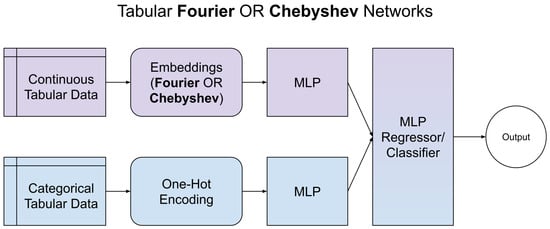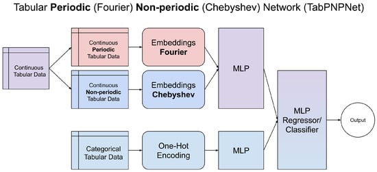 This section discusses our proposed neural architectures for processing tabular data. These are FourierNet, ChebyshevNet, PNPNet, AutoPNPNet, processing continuous numerical data only, and TabFourierNet, TabChebyshevNet, TabPNPNet, and TabAutoPNPNet, processing both continuous numerical and categorical features. FourierNet is a neural network architecture incorporating a Fourier-based neural encoder. The Fourier encoder transforms input features into a frequency domain representation, enabling the network to capture periodic patterns effectively. By applying the Fourier Transform, we decompose complex periodic signals into their constituent sinusoidal components, allowing the model to learn from frequency-based features that might be obscured in the original domain. However, not all patterns in tabular data are periodic. Datasets may also contain non-periodic, complex, non-linear relationships crucial for accurate predictions. To capture these patterns, we developed ChebyshevNet, which employs a Chebyshev-based neural encoder. Chebyshev polynomials are a sequence of orthogonal polynomials that approximate functions over a specific interval and are particularly effective in modeling non-linear behaviors. Using Chebyshev polynomials, we can approximate complex functions and capture intricate relationships within the data without assuming periodicity. FourierNet and ChebyshevNet process continuous data only. TabFourierNet and TabChebyshevNet also incorporate categorical data by processing it on a separate branch. Categorical data are one-hot encoded and passed through a Multi Layer Perceptron (MLP) for feature extraction. Then, the extracted features are concatenated to those extracted in the parallel branch for continuous data. Figure 1 provides a general working schema for TabFourierNet and TabChebyshevNet, illustrating their shared underlying mechanism.