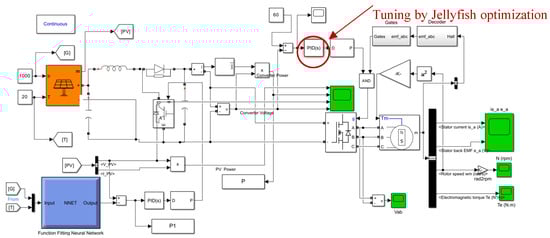 This paper presents the industrial relevance of PID controllers by optimizing their parameters with JSA and validating system performance through Monte Carlo simulations. An ANN based on the Levenberg–Marquardt method is employed to predict voltage, using the error signal input to the PID controller determine the optimal duty cycle. Optimizing MPPT in PV systems is critical for ensuring effective energy, extraction under varying weather conditions. This paper proposes an ANN–Jellyfish Search Algorithm (ANN-JSA) for MPPT, using nature-inspired optimization techniques. Solar modules are connected in series, with modern systems tested at 1000 V, compared to the 110 V system used two decades ago [15,16]. This study presents a novel integration of a PID-JC driven by an ANN to improve the efficiency and reliability of solar water-pumping systems. The research emphasizes how traditional PID controllers, though widely used, struggle to adapt to dynamic conditions, such as fluctuating solar irradiance and varying water demand.