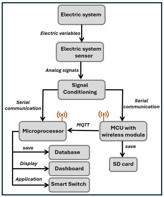 Figure 1 shows the schematic diagram of the designed SEM. First, the variables of an electrical system are read using an EPS, a sensor that delivers analog values to an MCU. Then, the MCU provides two SC media, the first for an MPU and the other for an microprocessor (MCU) with ESP8266. Regarding the MCU with ESP8266, it has two outputs: one to store data in SD memory and another where it communicates with the MPU through MQTT. Finally, the MPU can choose two means of data input: the SC and the MQTT. Once the data have been entered, they can be stored in a SQL database, visualized on a dashboard, and serve as input to an SS that can be used to automate household appliances in the SH.
