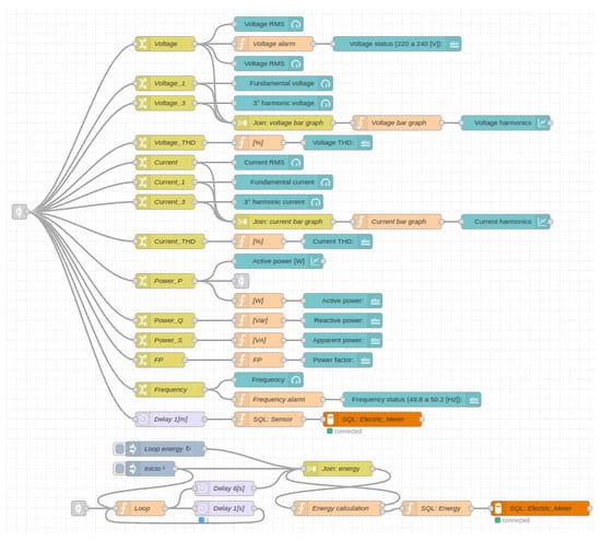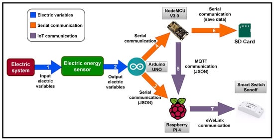 The Arduino UNO ATMega328P MCUs and NodeMCU V3.0 SoM ESP-12E were used for the SEM design. These MCUs were selected for the alternative of programming them through the Arduino IDE software and for their low cost in the market. The MPU used is the Cortex-A72 of the 8GB Raspberry Pi 4 Model B. This MPU was selected for its high processing performance and for its alternative to working with the Node-RED software. In addition, the SEM has a Sonoff SS, which is used for its reliability, data security, ease of use, and low cost. The diagram in Figure 2 follows the information flow of the designed SEM. The procedure is listed below: