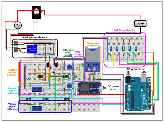 As for the hardware design of the EPS, the LM358 and NE555 integrated circuits were used to add the operational amplifiers, where the LM358 was used for the manual analog signal calibration functionality and the NE555 for the negative voltage generator. In addition, the noninvasive current sensors ZMPT101B (1:1 ratio) and HCT16K-TYT (1:2000 ratio) were used, where the former is used to measure the voltage and the latter the current. All the components used in the hardware design are low-cost and were already tested in the works mentioned in Section 2.1.