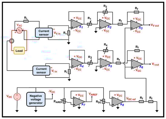 The second analog output represents the load current signal, which has the same structure as the first analog output, with as the divider amplifier, as the inverting amplifier (with and as variable resistors), as the subtracting amplifier, and as an input signal. is presented in Equation (2).