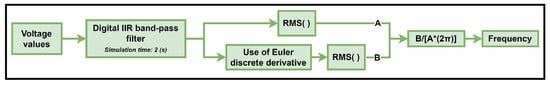 - Filter the voltage signal by simulating 2 s, using the digital filter of Equation (30). At this stage, the simulation time is essential because it is possible to obtain results quickly, for example, every 20 ms or one second.