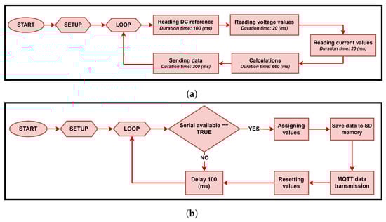 Figure 6a shows the diagram of the code used in the Arduino UNO. The code at startup enters the SETUP block, where the serial communication, analog reference, and digital inputs are initialized.