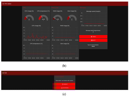 Regarding software, multiple studies from 2019 onward detail SCADA-like systems and IoT-based dashboards. Viciana et al. [28] integrated voltage, current, frequency, power, THD, and harmonics into a web-based panel called openZmeter, using an STM32 MCU and NanoPi AIR. Lu et al. [29] built a domestic control system for SHs with MQTT, HTTP, Node-RED, MySQL, and ten smart switches. Kao et al. [30] focused on IoT-based SCADA for motor inverters, using TCP/IP and a USB RS-485 module, while Aghenta et al. [31] employed MQTT and PostgreSQL in a low-cost SCADA for photovoltaics. Other notable platforms include Node-RED dashboards [32,33], ThingSpeak IoT [34], CSV-based logging [35], LabVIEW [36], and blockchain-based P2P trading [37]. Additional solutions rely on Thinger.IO [38], openZmeter [39], and MongoDB [40] for different IoT and SCADA implementations.