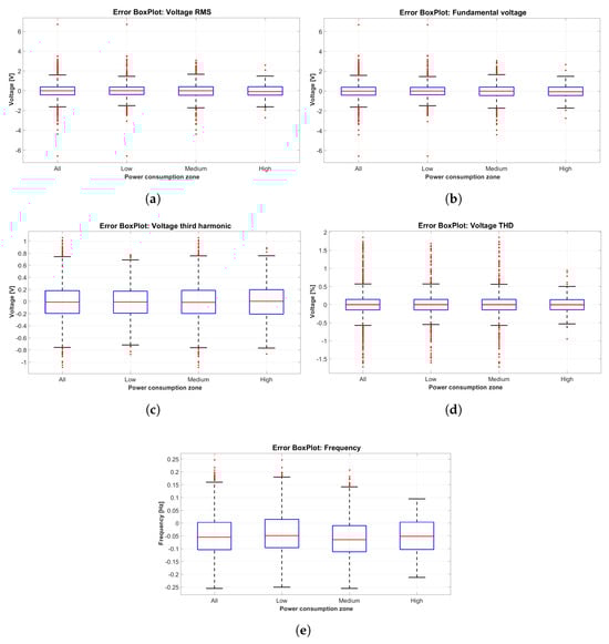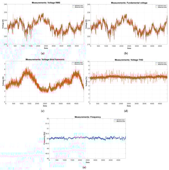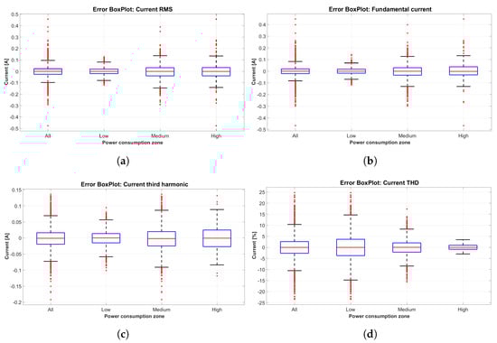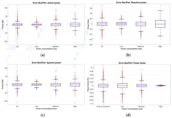 The electrical power values are obtained once the current and voltage values have been calculated, where Equation (26) represents the S, Equation (27) the P, and Equation (28) the Q. Furthermore, the calculation of reactive power is not affected by the harmonic content of the system, as the powers are trigonometrically related.