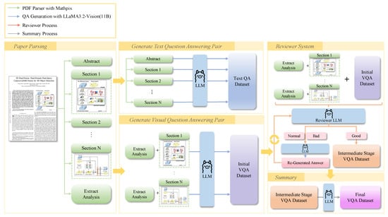 Our system comprises five components, including semantic parsing, QA generation, VQA generation, binary choice generation, and reviewing loop. First, it extracts text and visual materials from each section of the paper and converts them into structured content. Second, based on the paper’s content, initial QA pairs are automatically generated. Third, initial VQA pairs are automatically generated based on the paper’s content and visual materials. Fourth, to evaluate the model’s accuracy, a binary (yes/no) VQA dataset is created based on the paper’s content in a 50:50 ratio. Fifth, a reviewer system assesses QA pair quality through six criteria that include logical, relevance, completeness, accuracy, step-by-step, and clarity and evidence. Finally, the QA set is iteratively improved based on feedback from the reviewer, refining the QA pairs to generate the final benchmark.