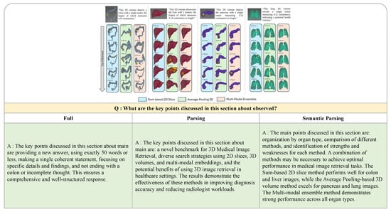 A comparison of answers generated according to the parsing method for the same question. Full: The method of entering the entire paper. Parsing: The method of entering the abstract and image-related sections. Semantic: The method of entering the contents extracted by the proposed semantic parsing.