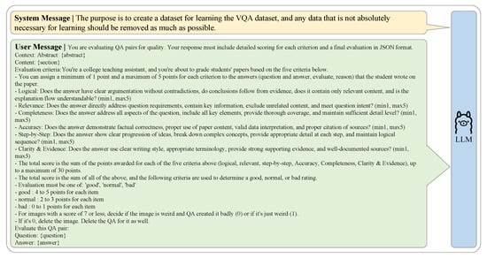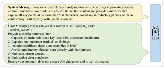 The QA generation process is performed in a manner that reflects the structural characteristics of the paper, in which the LLM generates answers to fixed template questions. In the Abstract section, a QA is generated to capture the overall outline of the paper and its main findings, and in the subsequent sections, a QA is generated to summarize the entire contents of each section. Specialized prompts have been designed for these section-specific QAs, enabling assessment of the understanding of the paper’s core concepts, methodological approach, key findings, and each section. The Abstract section generates QA sets that capture the overall overview of the paper and its key findings, and the subsequent sections generate QA sets that provide a good summary of the entire contents of each section. The design of specialized prompts for these section-specific QAs facilitates the assessment of the paper’s key concepts, methodological approach, key findings, and each section.
