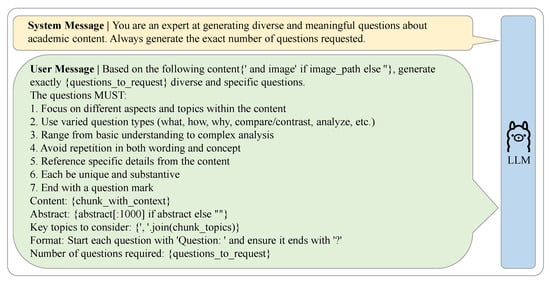 In the context of VQA, the system integrates the visual elements of the passage with the content to create questions that allow for a more accurate measure of comprehension. The prompting system is designed to analyze visuals and text together. It takes as input the content of the section containing each figure and the caption for the figure. At this stage, the system does not pre-classify the type of image; however, it automatically determines the nature of the image based on the input and generates appropriate questions. The question generation prompts are carefully designed to generate many meaningful questions about academic content; for example, a figure describing the structure of a system will naturally generate questions about structural understanding if the same prompt structure is used, and a graph showing the results of an experiment will naturally generate questions about data interpretation. The question generation prompts in Figure 5 are designed to take into account the given image, the section content, and the image description. They leverage this to generate a large number of questions that cover many aspects of all question types, from basic understanding to complex analysis.