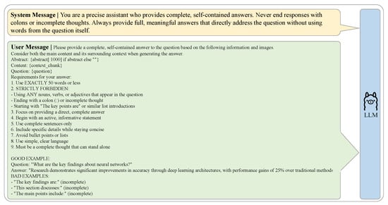 In particular, each question refers to specific details of the content while avoiding duplication and containing original and practical content. In order to ensure the efficacy of the answer generation process, it is imperative that prompts are concise, complete sentences are employed, and concrete content is utilized, thus avoiding the use of ambiguous directives. The quality of responses is contingent upon the prohibition of direct repetition of words used in the question, and the requirement of active and informative sentence structure.