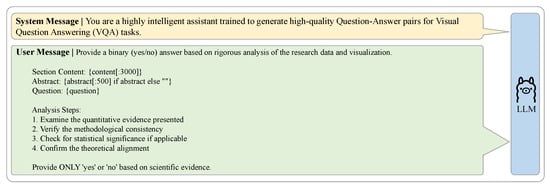 Binary choice evaluation is introduced to create an additional dataset for accuracy evaluation. This is achieved by effecting a partial alteration to the prevailing VQA dataset construction method, with a view to evaluating the effectiveness of the proposed system. When utilizing this system to generate data for the purpose of accuracy evaluation, a dataset consisting of binary QA pairs with a 50% ratio of yes or no responses is ultimately derived. The objective of this dataset is to facilitate an integrated analysis of visual elements and text, consistent with the construction of the general VQA dataset. To this end, the prompt system generates a QA pair by taking the contents of the section containing each figure and the image description (caption) as input. The questions are designed to reflect the professional knowledge and context of the paper as much as possible, and include advanced domain terms and methodologies, as well as the relationship between experimental conditions, parameters, and variables.