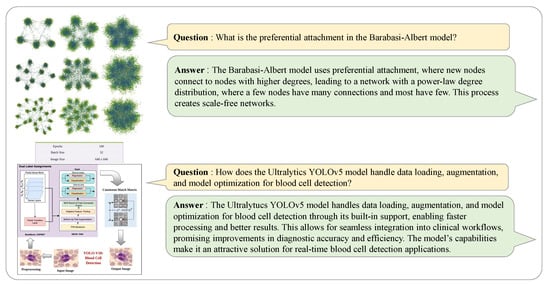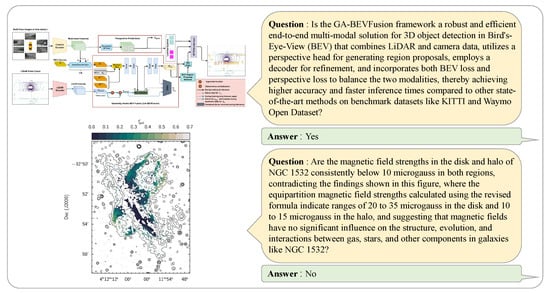 Visual question answering (VQA) refers to the task of receiving both an image and a question about the image as input, and then providing the correct answer to the question. It is used in related applications such as image captioning and video captioning. VQA is a multimodal model that builds upon the existing question answering (QA) framework by adding visual capabilities to process visual materials as input. The types of questions typically include those that can be answered with what, where, when, whose, how, how much/how many, and yes/no responses. ScienceQA [], a benchmark dataset in the scientific domain, consists of science-related questions and answers, comprising 21,208 multimodal multiple-choice problems. VQA-RAD [], a benchmark in the medical field, contains 3515 question–answer pairs for 315 radiology images, enabling interpretation of medical images and assisting in diagnosis.
