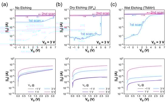 The transfer and output characteristics of WO3-based ECTs: (a) no etching, (b) dry etching, (c) wet etching.
