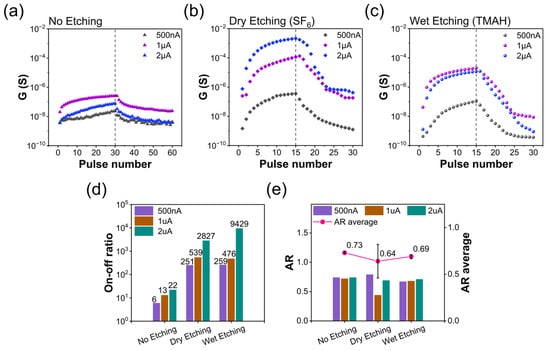The LTP/LTD characteristics for the WO3-based ECT (a) without etching, with (b) dry etching and (c) wet etching under different gate pulse amplitudes. The corresponding (d) on–off conductance ratio and (e) asymmetric ratio (AR).