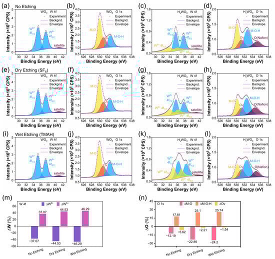 The X-ray photoelectron spectroscopy of W4f and O1s for the WO3 (a–d) without etching, with (e–h) dry etching, and with (i–l) wet etching, where WO3 and HxWO3 are the channel before and after protons injection. The percentage changes of (m) W content at different valence states and (n) O content at different binding states.
