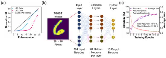 Figure 6b represents the MLP neural network model consisting of 784 input neurons, 64 × 3 hidden neurons, and 10 output neurons, respectively. The training and recognition process of the ANN was carried out in a training data set containing 60,000 images and a separate test data set containing 10,000 images, respectively. As for the weight updating method, based on Adam optimizer, we rewrite a gradient optimizer of discrete pulse coding, which realizes the pulse quantization of weight updating through a bio-inspired LTP and LTD look-up table (LUT). On the basis of retaining the adaptive learning rate characteristics of Adam optimizer, this optimizer replaces the continuous gradient update value with discrete pulse amplitude. Specifically, consistent with the traditional Adam optimizer, it first calculates the first moment (momentum) m and the second moment (variance) v of the gradient, and then calculates the original weight update amount Δw; on this basis, the continuous update amount Δw is realized by double look-up table (LTP/LTD-LUT). Then, we multiply it by the learning rate to obtain the final weight update.