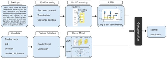Figure 1 shows the methodology used to explore textual data and metadata as multiple inputs in a hybrid deep learning framework comprising LSTM, ResNet, and DNN layers. The LSTM submodel processes the tokenized text using standard gating Equations (2)–(6). At the same time, the metadata are processed by ResNet and DNN blocks, which utilize skip connections to reduce vanishing gradients and generate robust feature embeddings. The outputs from these two streams are then concatenated and fed into a softmax classifier, producing the final classification of suspicious or normal. The text undergoes preprocessing, and metadata are enriched with additional features. The metadata features are input into the random forest feature selection algorithm to choose the most significant features. LSTM is used for sequential text, while a combination of ResNet and DNN layers handle the metadata. The goal is to utilize a multi-input model with features of varying characteristics and shapes.