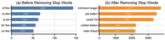 Figure 2 displays how removing stop words positively affects the correlation of a sequence of meaningful tweets. The top five biagrams before removing the stop words are shown in Figure 2a; the inference of meaningful sentences is hindered. After removing the stop words, the correlation between word sequences helps NLP models learn context, as shown in Figure 2.