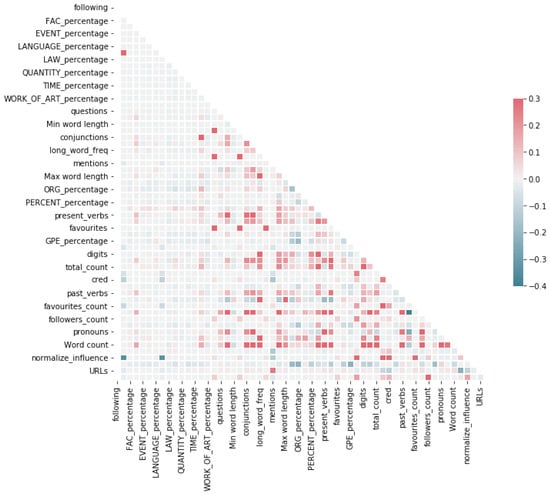 Both feature selection methods selected forty-two features. Thirty-five features were selected using the random forest selection method, while twenty-nine features were selected using the correlation method. These features have positive or negative correlations, as shown in Figure 3.