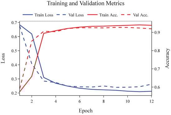 This search identified a configuration that yielded a significant performance improvement, with faster convergence and higher overall accuracy than our initial baseline. Specifically, the final model converged on a single LSTM layer with 64 units, a trainable GloVe embedding, 0.3 dropout on the numeric branch, and an Adam optimizer with a 0.01 learning rate. Figure 4 illustrates the training and validation performance for this best set of hyperparameters, plotting loss on the left y-axis with blue curves and accuracy on the right y-axis with red curves. Solid lines represent the training metrics, while dashed lines represent the validation metrics.