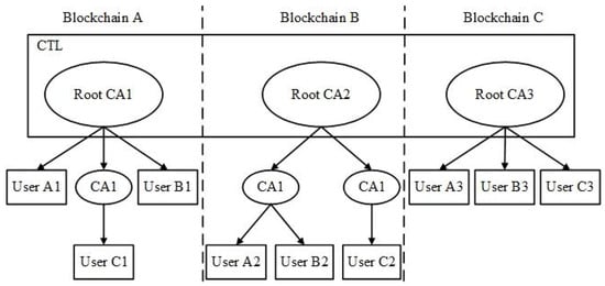 The consortium blockchain is also known as the permission blockchain. It is the identity audit and verification of the nodes that want to join the chain and the identity management of the nodes is realized through the access control part between the organizations []. The identity in the consortium blockchain determines the exact authority of the resource and the access to the information owned by the participants in the blockchain network. Identity management is mainly realized through the Public Key Infrastructure/Certificate Authority (PKI/CA) system. For example, CAs are built in the consortium blockchain such as Hyperledger Fabric and Blockchain Open Source (BCOS) to verify identity. In the consortium blockchain, CA often appears in a cluster manner, usually using a hierarchical model. For example, there are multiple CAs in the Fabric, and each intermediate CA has a parent CA, which can eventually be associated with the Root CA through this relationship. Based on ensuring sufficient certificate processing ability, this trust model is more convenient for generating a certificate chain and building a trust path.