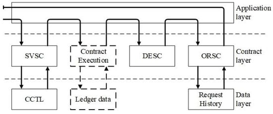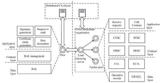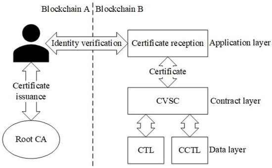 After the cross-chain distributed trust model is formed, the trust transfer can be achieved among the consortium blockchains, hereby the cross-chain trusted communication can be realized. The common blockchain hierarchical structures include a data layer, network layer, consensus layer, incentive layer, contract layer, and application layer. Because this study is oriented to the consortium blockchain, the consortium blockchain will not adopt the consensus algorithm of an incentive nature such as Proof of Work (POW), there is no incentive layer. The consensus algorithm is regional, so usually the cross-chain scheme does not involve the integration of the consensus layer, and there is no design of the consensus layer in this study. This study focuses on certificate reception and cross-chain identity verification, mainly on the contract layer and application layer. The model is shown in Figure 3.