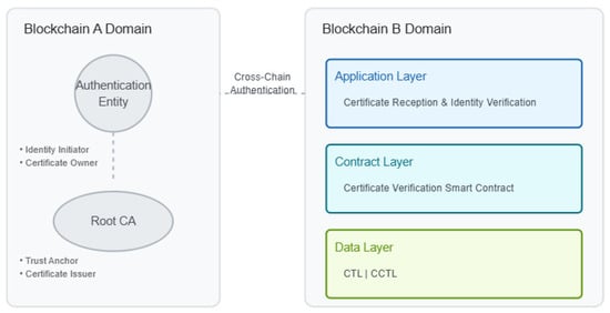 Figure 4 illustrates the sophisticated cooperative framework for the suggested cross-chain validation approach. This structure includes two main blockchain areas, each with unique functional layers and interaction techniques. On Blockchain A, the Authentication Entity starts the cross-chain authentication and possesses certification rights, whereas the Root CA acts as the trust hub and issuer. Blockchain B features a tri-layer design: The Application Layer manages certificate acceptance and identity authentication mechanisms; the Contract Layer verifies certificate verification via smart agreements; and the Data Layer upholds both the Certificate Trust List (CTL) and Communication Certificate Trust List (CCTL) for solid trust administration. This tiered arrangement guarantees secure and effective cross-chain authentication, preserving the independence of separate blockchain networks.