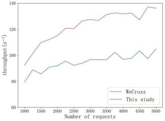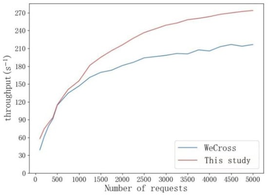 From the comparison results of write operations, the scheme in this study shows some advantages in terms of delay and throughput compared with WeCross. The write operation of the scheme in this study always maintains the advantage of about 26 ms and the performance is also relatively stable. Compared with the single-chain write operation under the same conditions, the delay of cross-chain write operation increases by about 60 ms, which is mainly affected by network communication. The change in throughput is more significant because cross-chain requests can be executed by multiple nodes. Although the delay increases, the throughput is still significantly improved. The throughput of this scheme basically maintains the advantage of 27TPS compared with WeCross.