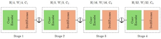 The EAA consists of four hierarchical stages of different scales , each of which is consistent and composed of a Convolutional Encoder and a SwiftFormer encoder [], with a downsampling layer introduced between two consecutive phases to halve the spatial size and increase the feature latitude. The structure of EAA is shown in Figure 1. The Convolutional Encoder consists of a 3 × 3 depth convolution [] and two point-state convolutions []. The initial module of the SwiftFormer encoder consists of a 3 × 3 depth convolution followed by a point-state convolution [], followed by an efficient additive attention module. Finally, the output features are fed into a linear module that consists of two 1 × 1 point-state convolution layers, batch normalization, and GeLU activation [].