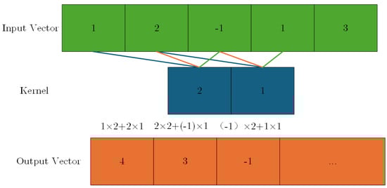 The CNN consists of two Conv1D (one-dimensional convolutional layers) combined with a fully connected layer and an attention mechanism. It merges a MaxPooling layer and a Rectified Linear Unit (ReLU) layer between two consecutive convolutional modules to fully capture spatial dependencies []. A Conv1D operation with input channel 1, output channel 16, convolution kernel length 3, and step size 1 is applied to the sample set in the first convolutional layer to filter the noise and extract the valid information. Figure 2 shows an example of a simple one-dimensional convolution operation. Denote as the input matrix of the 0th convolutional layer in the region matrix at time t. Then, the network layer is represented as shown in Equation (9):