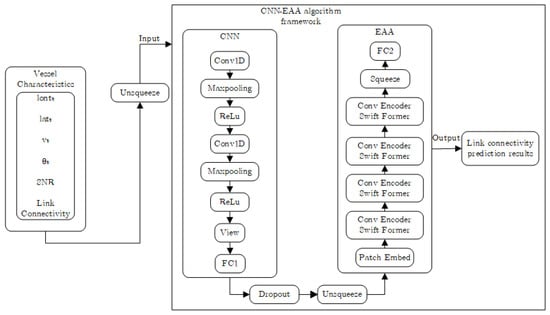 In this paper, we propose a routing strategy for assessing link connectivity based on deep learning. Firstly, the CNN–EAA model is used to judge the link connectivity state: CNN can extract the effective features of the ship nodes, and EAA makes the model pay more attention to the important features and focuses on learning the connectivity prediction result of the link. Finally, the intelligent prediction of the link state is combined with the comprehensive attributes of the nodes, taking into account the node’s historical value of the probability of encounter, the availability of resources in the latter day and the movement situation, and the design of the routing scheme, which effectively improves the message delivery rate and reduces the resource consumption and network overhead. In this paper, we design a routing scheme based on link prediction, which can better adapt to the maritime opportunistic network environment where the link state is highly changeable. Furthermore, the prediction of broken or potentially unavailable links also improves the reliability of communication; it improves the traditional link prediction method based on time-series learning [] and the link connectivity judgment method, which is computationally complex and occupies a large amount of memory.