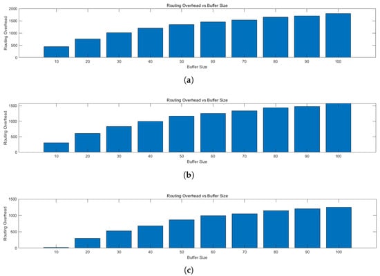 Comparison of routing overhead with different buffers: (a) SprayAndWait; (b) RSNA; (c) Deep learning-based routing for assessing link connectivity.