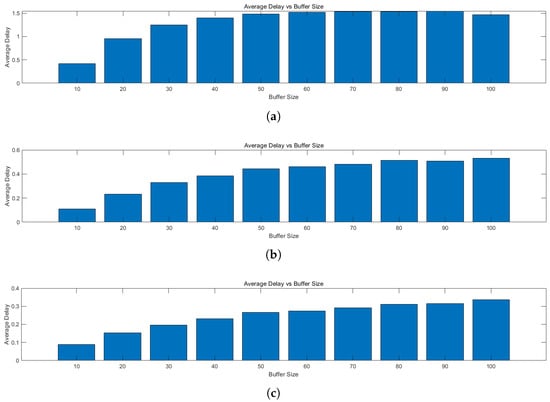 Comparison of average delay with different buffers: (a) SprayAndWait; (b) RSNA; (c) Deep learning-based routing for assessing link connectivity.