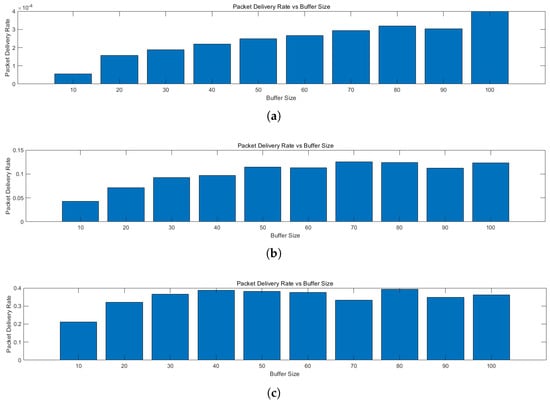 Comparison of packet delivery rate with different buffers: (a) SprayAndWait; (b) RSNA; (c) Deep learning-based routing for assessing link connectivity.