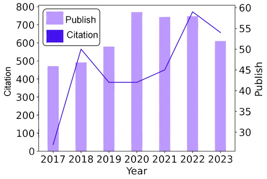 As Moore’s Law gradually becomes less effective, traditional chip architectures that rely on improving the performance of a single computing core are increasingly facing significant difficulties. The enhancement of computing power is no longer dependent on increasing the number of transistors. To address this challenge, heterogeneous chip architectures have gradually become an important key technology in modern computing systems. Figure 1 presents the publication and citation statistics of papers related to heterogeneous chips and task scheduling. The data in the figure come from the Web of Science [1]. From 2017 to 2023, the annual average citation growth rate was 29.51%, while the number of papers published each year increased by 100%, as shown in Figure 1. By integrating various types of computing units, such as central processing unit(CPU), graphics processing unit (GPU), field programmable gate array (FPGA), and specialized accelerators, heterogeneous chips can optimize for different task requirements, which provides more flexible and efficient computational ability. This architecture not only improves computational density and overcomes the performance limitations of single-processor architectures but also achieves a better balance between power consumption, performance, and cost [2].