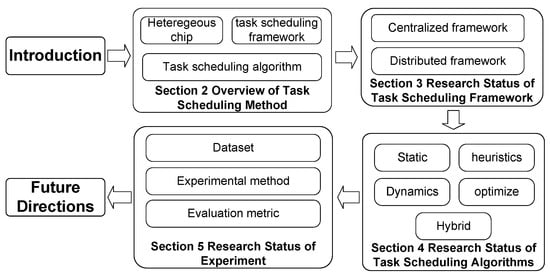 The subsequent structure arrangement of this paper is presented in Figure 2. Section 2 describes the basic knowledge of heterogeneous chip task scheduling. Section 3 focuses on classifying the task-scheduling framework emerging in recent years. Section 4 classifies and summarizes the recent task-scheduling algorithm in detail. Section 5 introduces the experimental method and evaluation metric of the task-scheduling method in detail. Section 6 analyzes challenges, limitations, and the future direction of task-scheduling methods for heterogeneous chips. Section 7 is a conclusion of the full text.