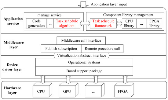 A heterogeneous chip refers to the integration of many different types of processor cores on a single chip, and these cores are different in instruction set architecture, microstructure, manufacturing technology, and even packaging technology. These differences mean that heterogeneous chips have unique advantages, according to the characteristics of different flexible tasks, and allocate different types of core resources in order to achieve better computing efficiency and resource utilization efficiency. In contrast, homogeneous chips are different in dealing with diverse tasks and may face the limitation of insufficient resource adaptation [5]. The common architecture of heterogeneous chip platforms is shown in Figure 3. Figure 3 illustrates a layered architecture for heterogeneous chip task scheduling, where the middleware layer comprises code generation, task-scheduling algorithms, and component libraries for various hardware such as CPU, GPU, and FPGA. It interacts with the device driver layer through virtualization abstract interfaces and operational systems, ultimately managing the task scheduling across the hardware layer.