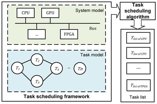 The task-scheduling framework of heterogeneous chips is used for the overall planning and management of the software architecture system of task allocation and resource application in heterogeneous chips. Relying on various computing units as the core resources, it can accurately and reasonably allocate diversified tasks to the appropriate computing units with its built-in scheduling algorithm mechanism. The core objectives of the framework focus on maximizing resource utilization, significantly improving overall system performance, and effectively reducing in energy consumption [6,7]. Figure 4 describes the scheduling framework and scheduling algorithm of the heterogeneous chip. As shown in the figure, the scheduling framework, as the key carrier for the effective operation of the scheduling algorithm, provides functional support for the smooth operation of the algorithm, including the task model and system model, to ensure the scheduling algorithm obtains an appropriate task list [8]. Task-scheduling algorithms are key techniques in heterogeneous chip systems that determine how to allocate and perform various computational tasks efficiently. The main goal of task-scheduling algorithms is to optimize the allocation of tasks between different computing resources to improve the overall performance and resource utilization of the system while reducing energy consumption [9]. Scheduling algorithms guide the framework on rationally assigning tasks to various computing units of heterogeneous chips through specific computation and decision rules. The heterogeneous task-scheduling method is an NP-hard problem called [10].